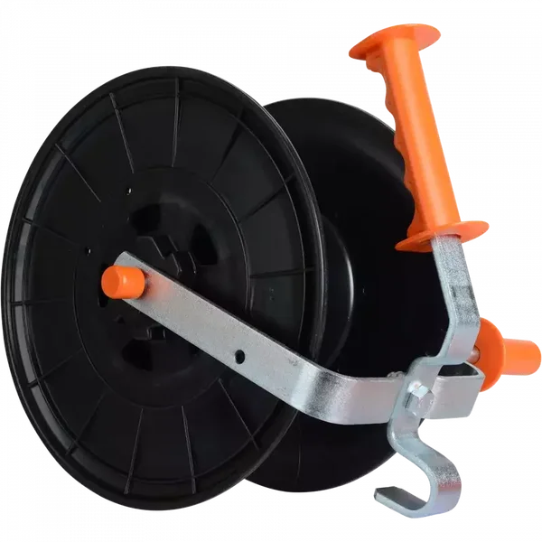 Un enrouleur très robuste avec armature métallique pour enrouler et dérouler le fil synthétique et ruban. Doté de poignée isolante.